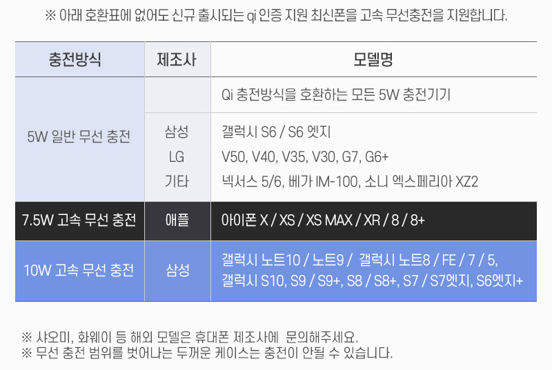 그리고 애니젠 고속 무선 충전기는 퀄컴 3.0을 지원해서 기기 인식률이 뛰어나다고 합니다. 그러다보니 기기를 자동인식하여 스마트폰에 맞는 5W, 7.5W, 10W 충전을 지원합니다.